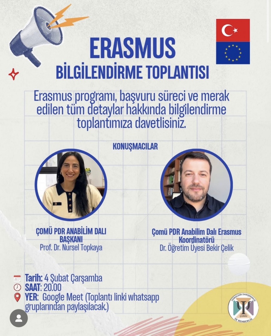 Çanakkale Onsekiz Mart Üniversitesi (ÇOMÜ) Rehberlik ve Psikolojik Danışmanlık Anabilim Dalı tarafından düzenlenen "Erasmus Bilgilendirme Toplantısı", 4 Şubat 2026 tarihinde çevrim içi ortamda başarıyla gerçekleştirildi. Anabilim Dalı Başkanı Prof. Dr. Nursel Topkaya ve Erasmus Koordinatörü Dr. Öğretim Üyesi Bekir Çelik’in konuşmacı olarak yer aldığı etkinlikte, öğrencilerimize uluslararası hareketlilik programları hakkında kapsamlı bilgiler sunuldu.